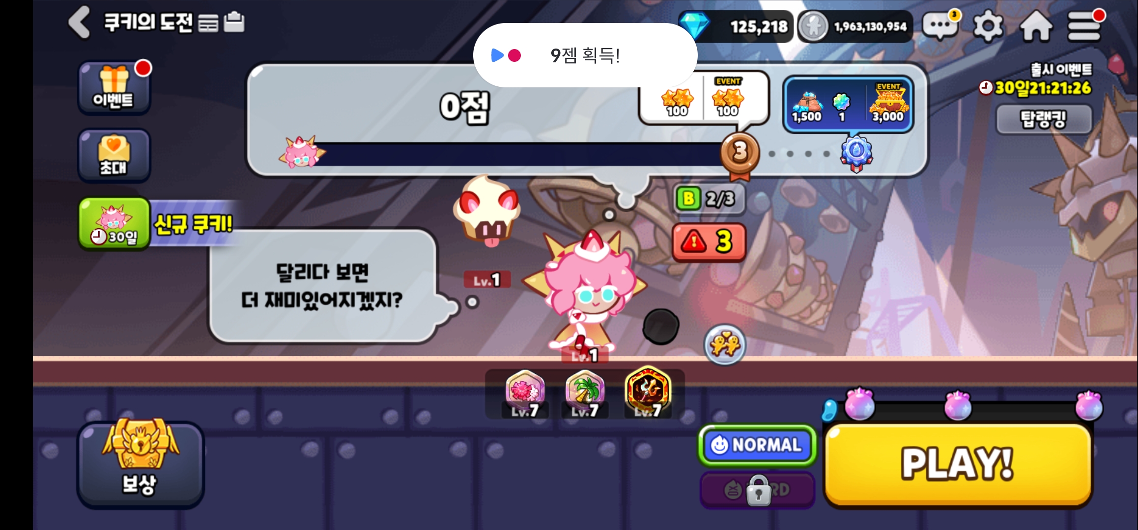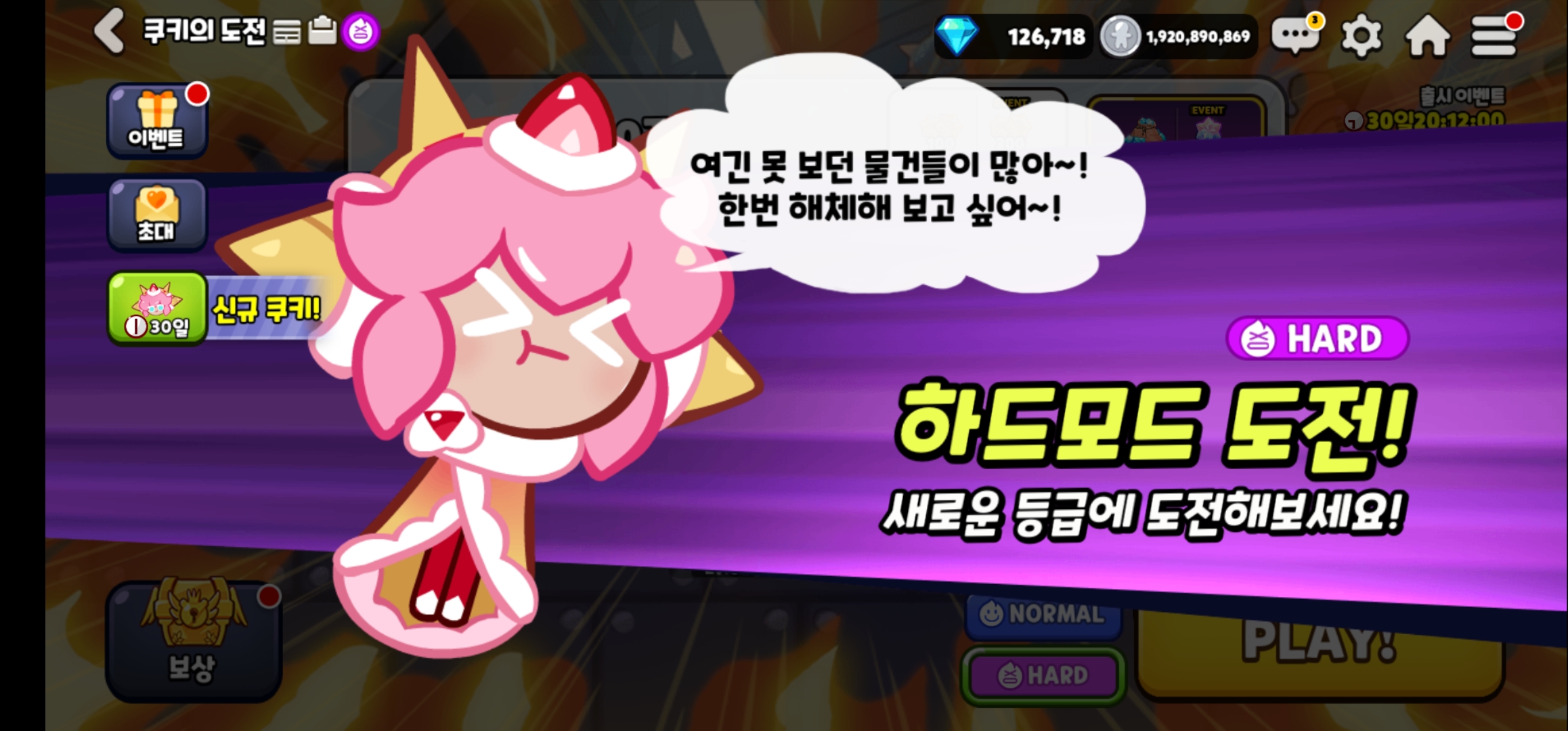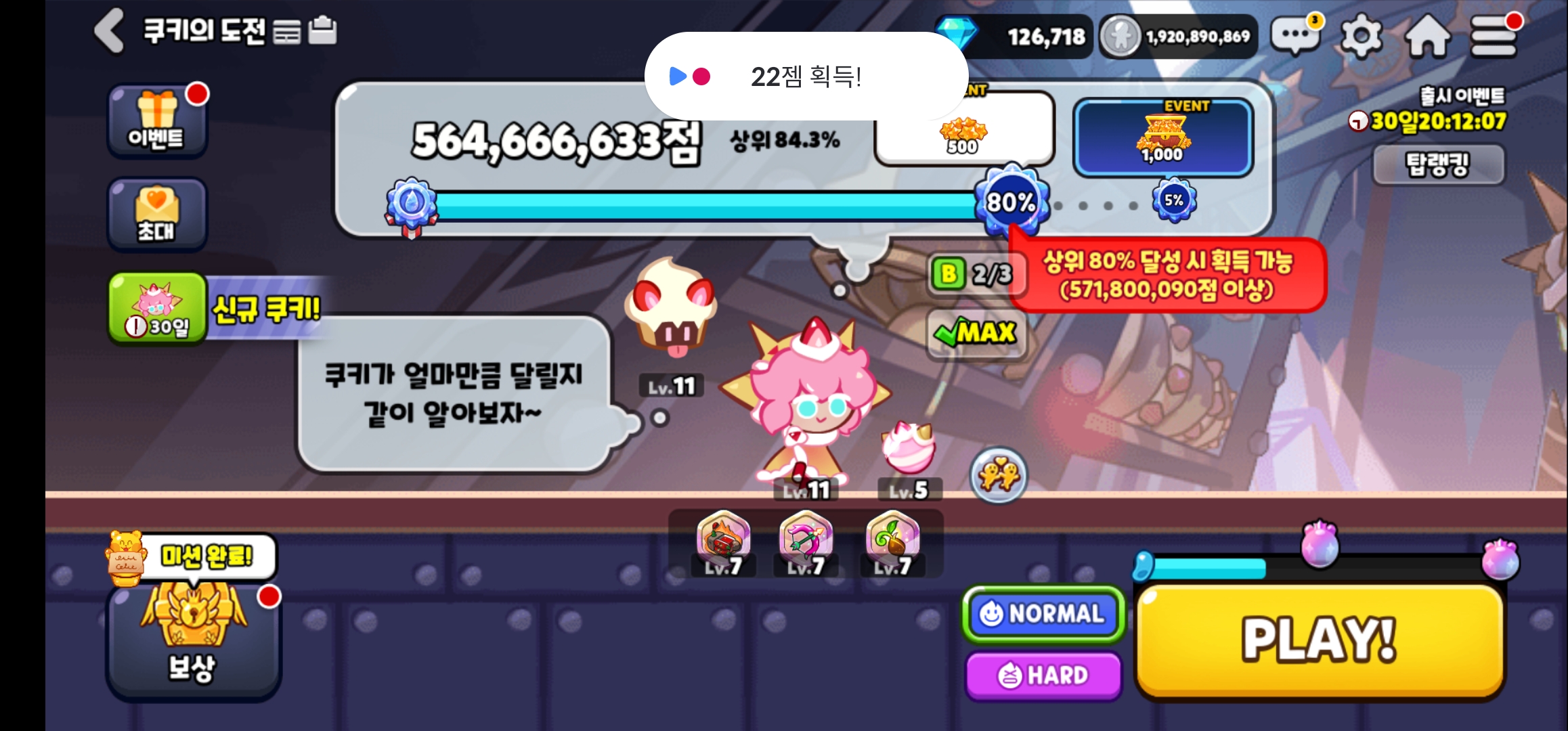하드모드도 바로 도전! 하드모드의 기본 조합은 쿠키 11, 펫11, 마법사탕5, 부활이 붉은 알7, 파도방울 소라껍데기7, 금지된 마법서 조각7로 조합합니다.