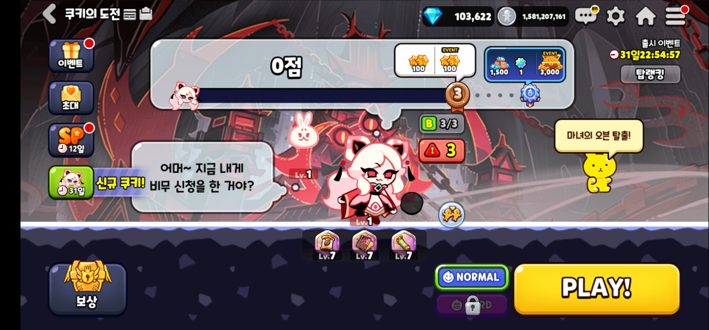 하드모드 기본 조합은 쿠키12, 펫11, 마법사탕5, 부활의 붉은 알7, 완벽한 보물지도7, 흑마공 비급서7 로 조합합니다.