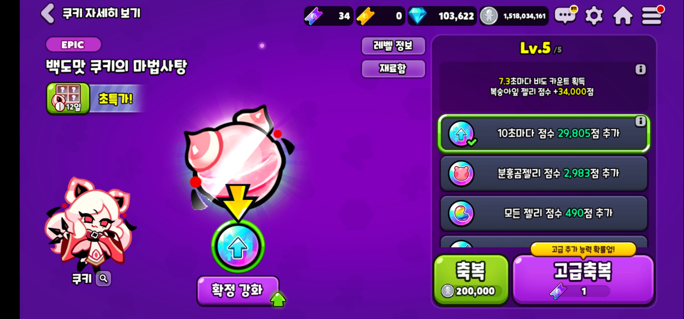 마법사탕의 능력은 7.3초마다 비도 카운트 획득, 복숭아잎 젤리 점수 +34,000점을 획득
